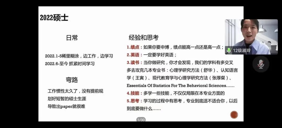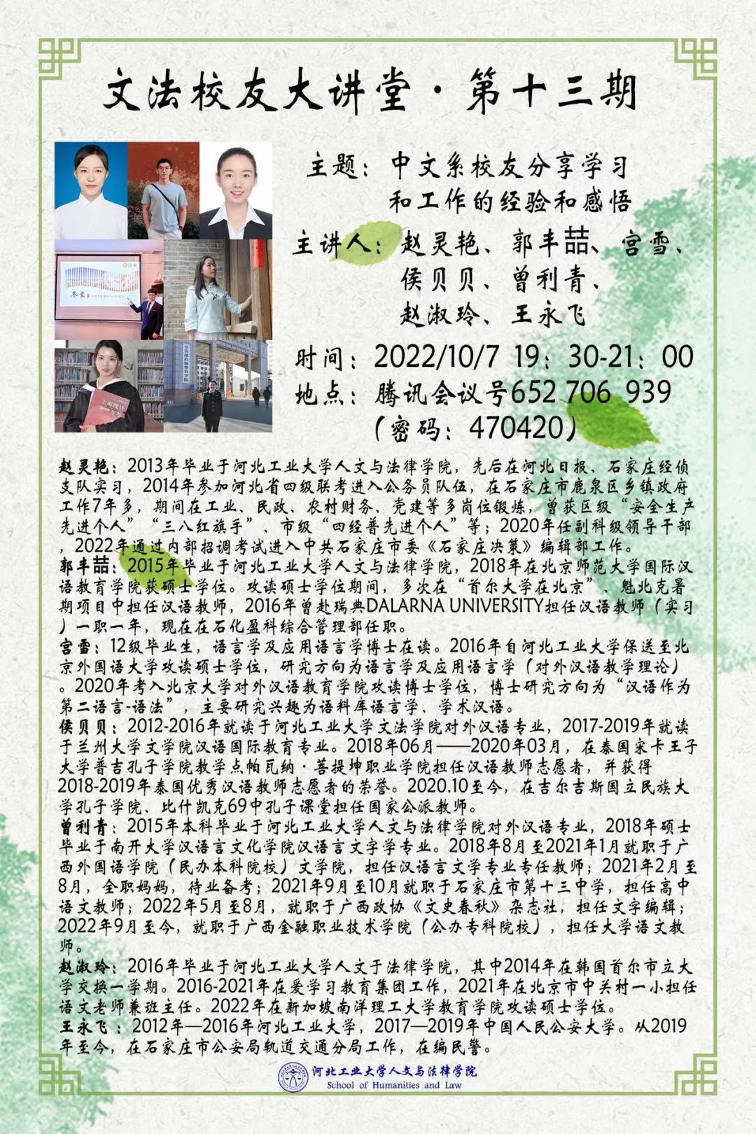 10月7日晚7点半,电竞博彩网站-中国电竞博彩 特邀中共石家庄市委《石家庄决策》编辑部部员赵灵艳、石化盈科综合管理部部员郭丰喆、大学语文教师曾利青、孔子电竞博彩网站 国家公派教师侯贝贝、北京大学语言学在读博士宫雪、新加坡南洋理工大学教育学在读硕士赵淑玲、石家庄轨道交通分局民警王永飞等校友做客线上讲座,为同学们分享他们在学习和工作中的经验与感悟,提供更多可行性建议。