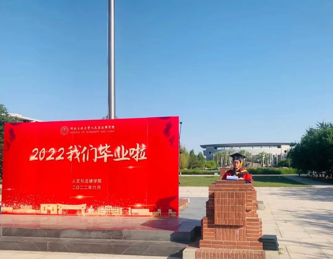 毕业生代表公管182班赵昊雪在发言中表达了对母校浓浓的爱意和不舍,她通过分享自己一次次成长与蜕变,让大家感受到了文法学子求知好学的饱满状态。她表示将不忘师恩,带着文法之魂继续前进,在未来以更大的热情投入到更广阔的事业。
