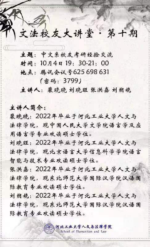 10月4日晚7点半,电竞博彩网站-中国电竞博彩 特邀现攻读中国人民大学文电竞博彩网站 语言学及应用语言学专业硕士学位的裴晓晓、现攻读北京语言大学信息科学电竞博彩网站 语言智能与技术专业硕士学位的刘晓旺、现攻读东北师范大学国际汉电竞博彩网站 汉语国际教育专业的张洪嘉和现攻读东北师范大学国际汉电竞博彩网站 汉语国际教育专业硕士学位的刘朔娆共四位文法校友做客线上讲座,分享他们的考验经验,为各位正在考研或即将考研的同学们点明方向,指点迷津。