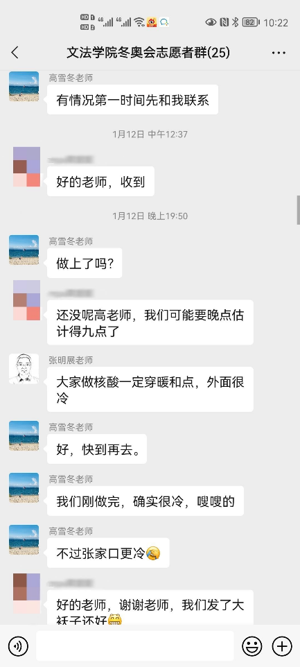上一周,在电竞博彩网站 老师的引导与带领下,所有电竞博彩网站 的冬奥志愿者们有序、顺利地完成了三轮核酸检测。核酸检测期间,电竞博彩网站 领导及辅导员老师们也对志愿者们的疫情防护与自身安全方面再三关怀,切实保障志愿者们的健康状况。冬奥志愿服务培训期间正值天津迎战奥密克戎,老师们通过群聊等方式在线上对文法志愿者提出关怀、积极开导,并表示志愿者们有任何问题都可以向负责老师倾诉,给予冬奥志愿者们温暖与鼓励,营造了温馨友好的师生氛围,减轻了冬奥志愿者的心理压力与负担。