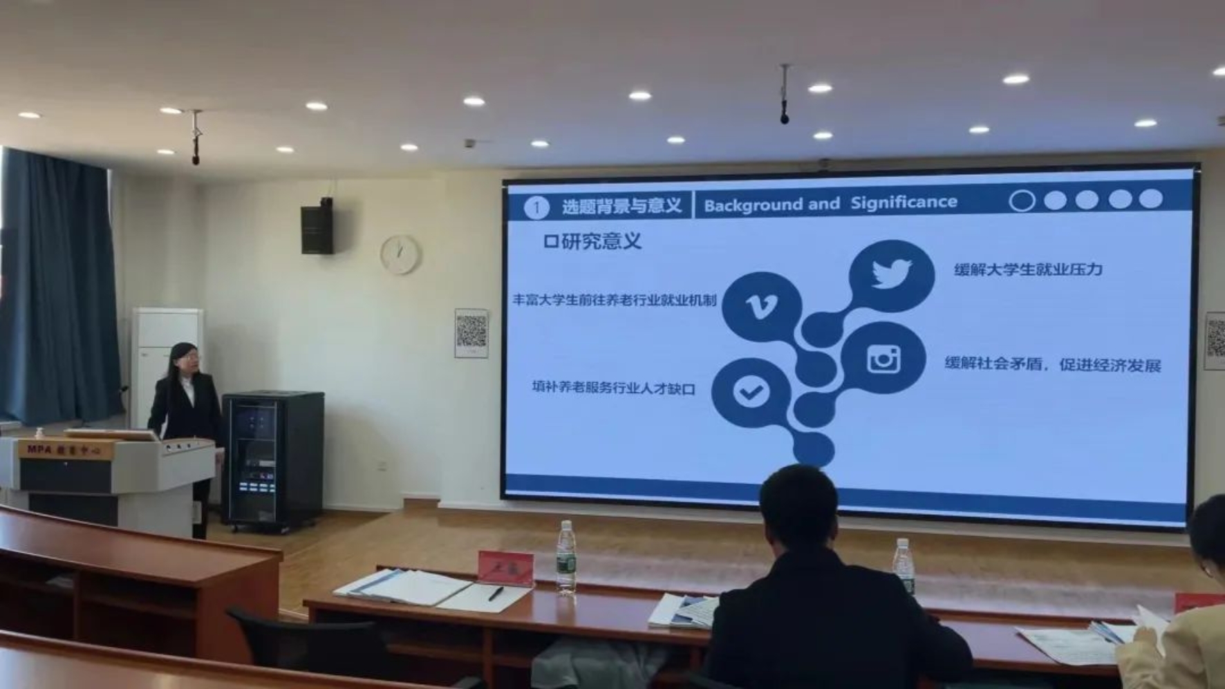 第一支队伍专注社会养老方面,提出“大学生养老行业就业机制及社区养老模式创新研究”项目,通过分析当代大学生的就业去向及对待养老行业的看法以及社区养老模式的设想等方面来阐述项目意义,其项目内涵获得评委老师的肯定;