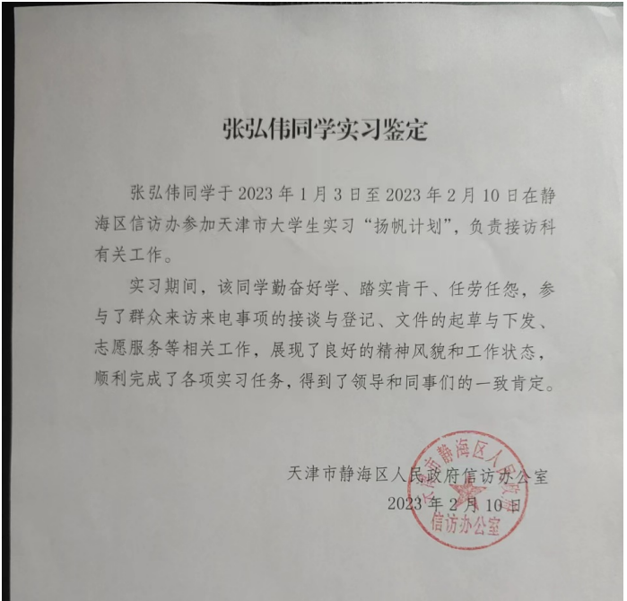 在天津市静海区信访办实习的张弘伟同学认真接待群众来访,同信访办工作人员一同下社区走访、慰问。认真的工作态度和严谨踏实的工作作风得到了实习单位的欣赏与肯定。
