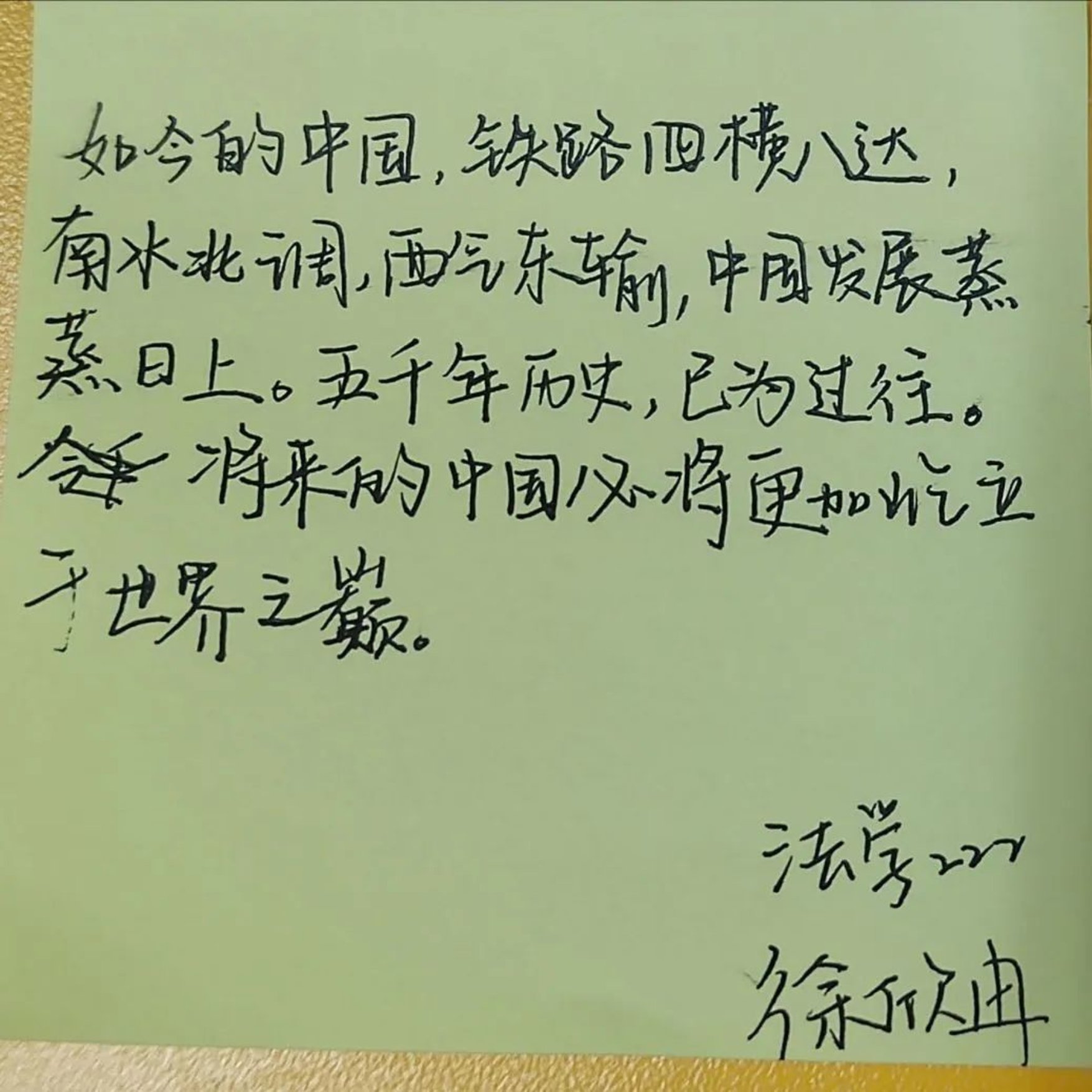 法学222班徐欣冉:如今的中国,铁路四通八达,南水北调,西气东输,中国发展蒸蒸日上。五千年历史已为过往,将来的中国必将更加自信地屹立于世界之巅。