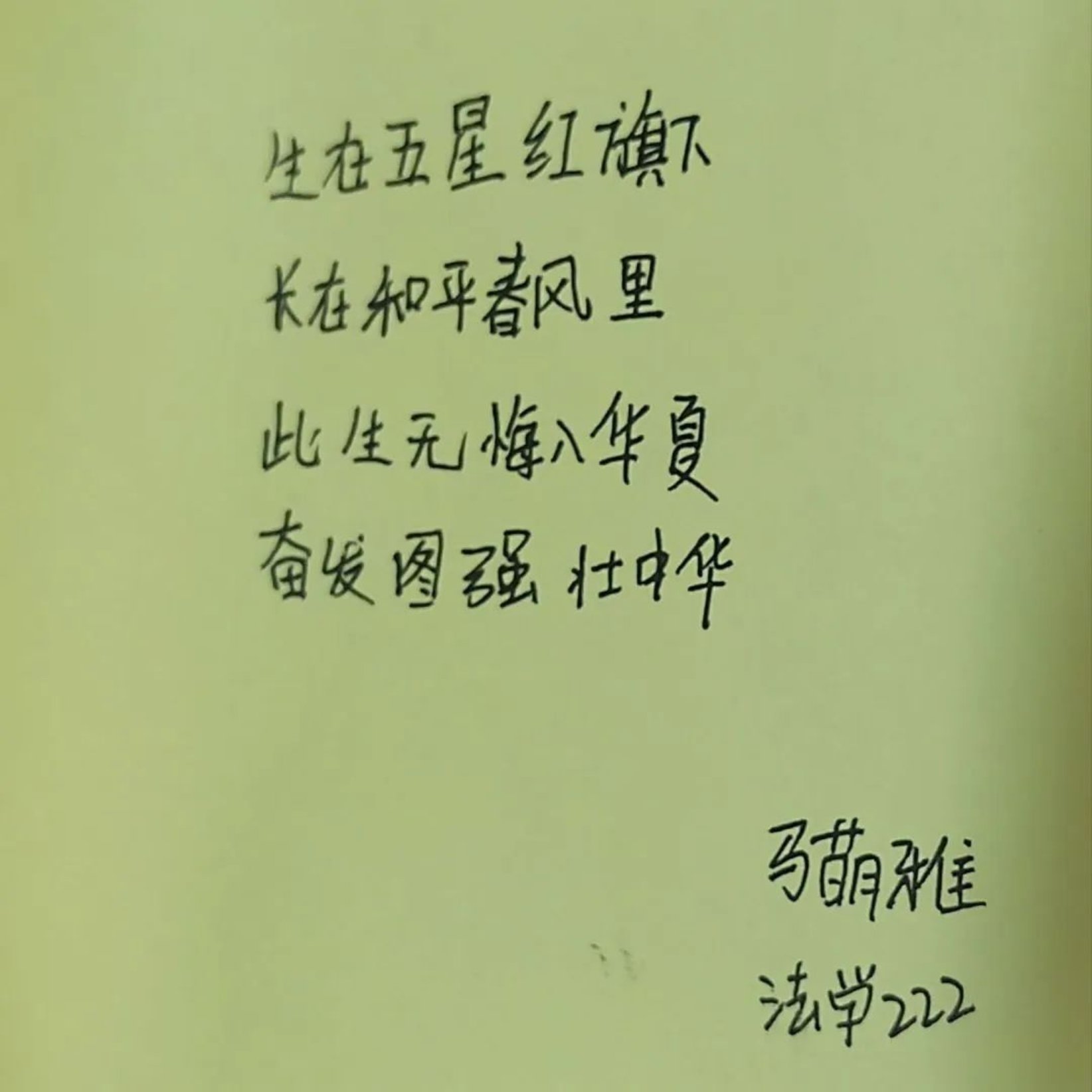 法学222班王萌雅:生在五星红旗下,长在和平春风里,此生无悔入华夏,奋发图强壮中华。