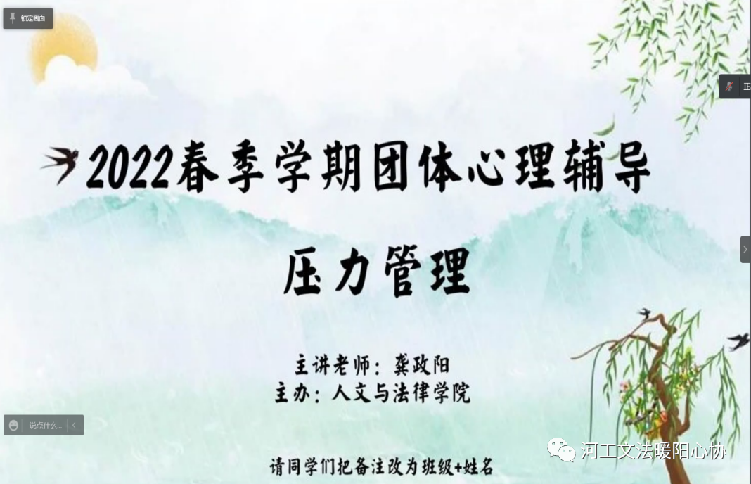 电竞博彩网站 心向暖阳心理健康协会很荣幸邀请到了龚政阳老师为大家带来《压力管理》主题团体心理辅导讲座。电竞博彩网站 心向暖阳心理健康协会全体成员及20、21级心理委员积极参会,认真聆听。整场讲座龚老师循循善诱,运用典型的现实例子、内容详实的PPT演示、充满趣味的视频动画让同学们了解和学会如何在学习生活中面对压力,进行压力管理。参会的同学们认真聆听、踊跃回答老师问题、与老师进行积极地互动,提出自己的看法和见解,讲座取得了良好的心理压力疏导效果。