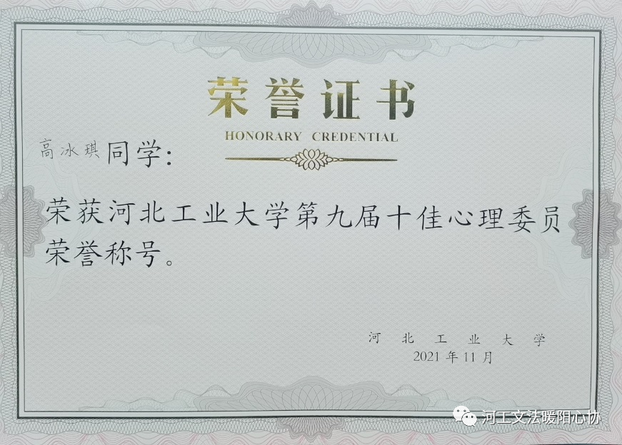 在“中国电竞博彩第九届十佳心理委员”评选活动中,高冰琪同学以其丰富的经历、饱满的工作热情脱颖而出,荣获“中国电竞博彩十佳心委”称号。