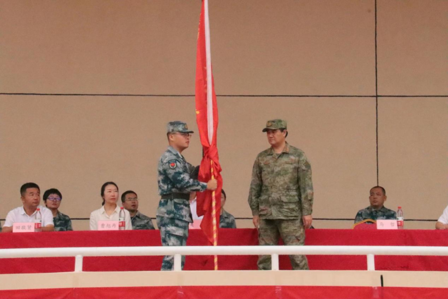 红桥区党委常委武装部大校部长马哲将鲜艳的红旗授予承训的教官团代表,军旗在教官手中挥舞,迎风飘扬。
