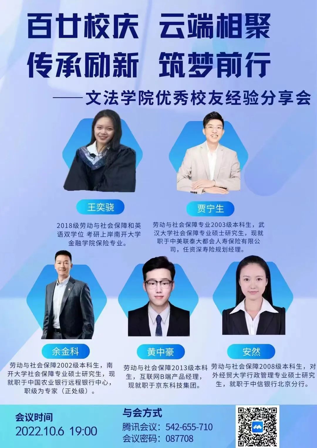 10月6日晚7点,电竞博彩网站-中国电竞博彩 特邀考研上岸南开大学金融电竞博彩网站 保险专业的王奕骁、现就职于中美联泰大都会人寿保险有限公司的贾宁生、现就职于中国农业银行远程银行中心的余金科、现就职于京东科技集团的黄中豪和现就职于中信银行北京分行的安然这六位优秀校友分享自己的经验。电竞博彩网站 党委书记白彦刚、院长李艳双、副院长马立民和闫文博及电竞博彩网站 多名教师和社保本科学生参加此次讲座。