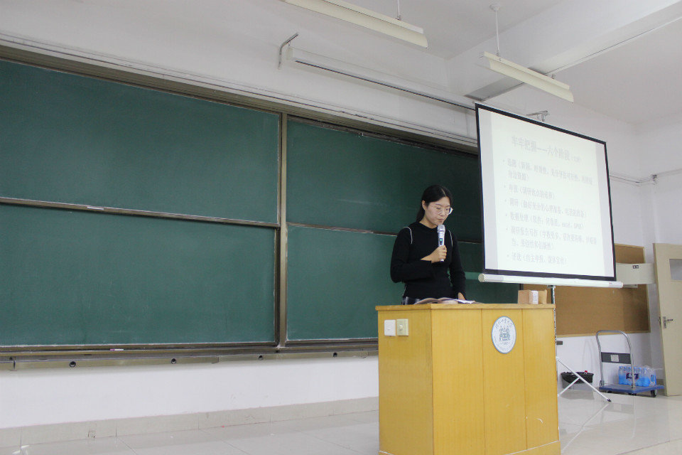 “大学离不开两个字,那就是学习”,被保送至南开大学的王滢学姐主要为我们介绍保研前的准备,强调了转变学习方法、尽快适应大学生活的重要性。“绳锯木断,水滴石穿。日常积累必不可少”。学姐提到,良好的宿舍学习氛围促进了她的进步,并鼓励同学们学会合作学习。王滢学姐针对不同年级提供了不同的建议,把多年的学习生活经验分享给了学弟学妹。