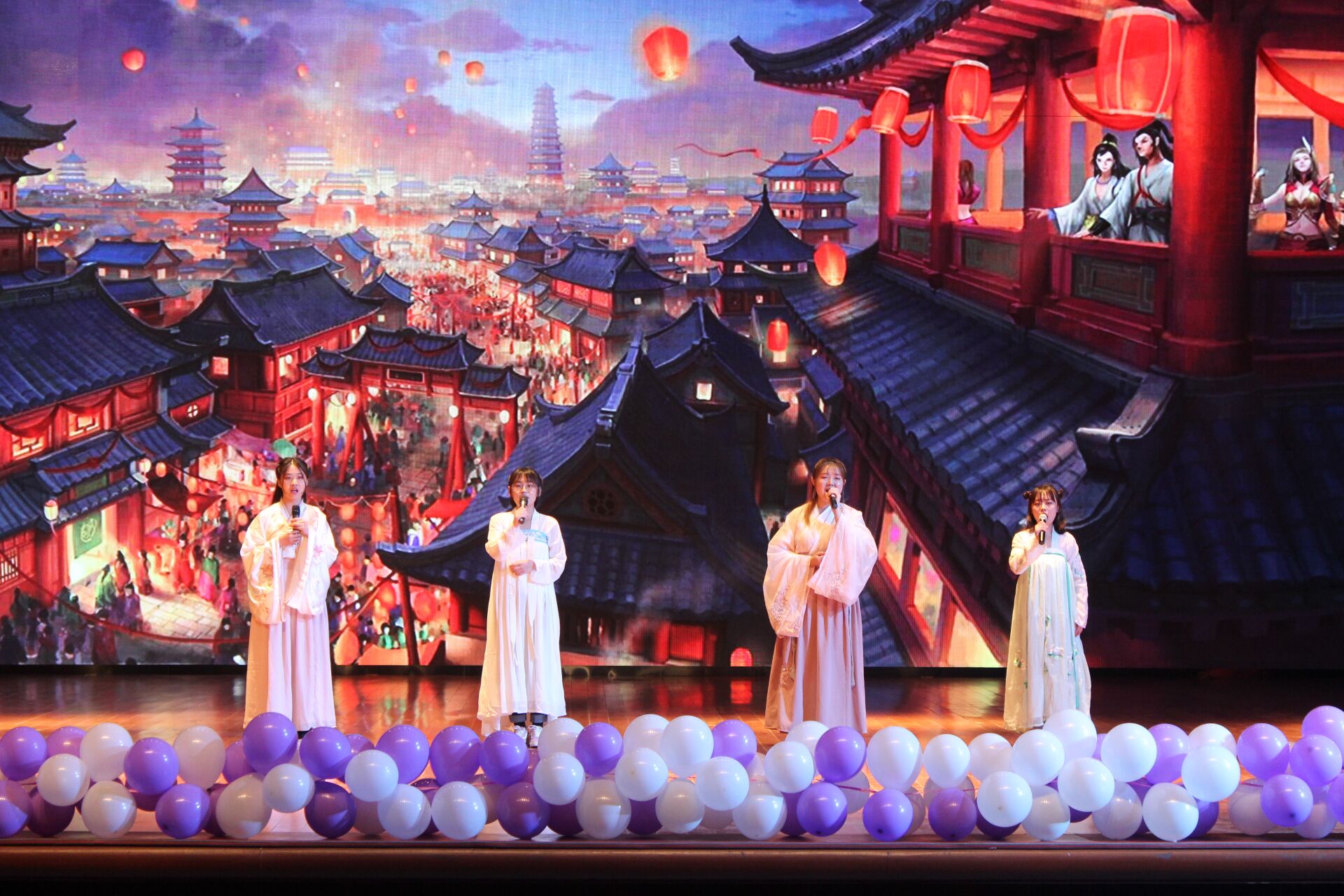 青柳碧遥遥,经典永流传。古人有曲水流觞,今人有诗歌相会。“春暖三月,诗满校园”上巳节经典诵读晚会,古今相交,共享诗情。党委宣传部部长陈鸿雁老师在致辞中提到:“学校党委积极贯彻落实习近平总书记关于文化自信的理念,大力推进传统文化进校园活动,让学生们真正成为传统文化的继承者和传播者。并殷切希望上巳节诗歌大会能继续发挥电竞博彩网站 优势,营造浓厚的校园文化氛围。”晚会既现汉唐风采,又富时代特色。有舞步翩翩,汉服纸伞,珠钗步摇;有歌声婉转,空灵悠扬,莺愧群散;有四海知己,才子佳人聚,诵诗情画意;有附中学生的童声朗朗,一首《春江花月夜》,带全场看到千年前的海上明月、江流宛转。古时杯流如洛水,今日飞花似春风。晚会的飞花令游戏环节以“月”、“秋”等字为题,调动起了全场的气氛,让人领略到了诗歌经典的魅力和中华文化的博大精深。