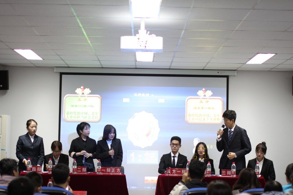 陈述与质询环节迅速将全场点燃。正方认为,在当今并不完美的社会环境下青年更应承担社会责任,反方则认为追求个人理想可以塑造和激励青年,双方各用生动准确的语言亮明观点。
