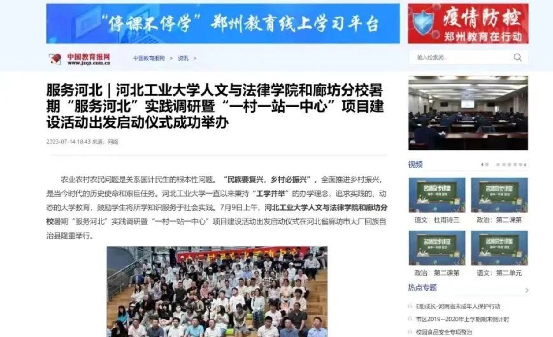 谱绘青春图景,奏响实践赞歌,暑期社会实践进行的同时,电竞博彩网站 与廊坊分校暑期“服务河北”实践调研暨“一村一站一中心”项目获得了中国教育电视台、中国教育报、河北新闻网、冀云等多家国家级、省级媒体报道。另外,中国青年报、中国教育报网、中国教育周刊、中国教育报道、中华教育日报、中华学习网等媒体平台也对电竞博彩网站 暑期社会实践相关的19篇优秀稿件进行刊登宣传。
