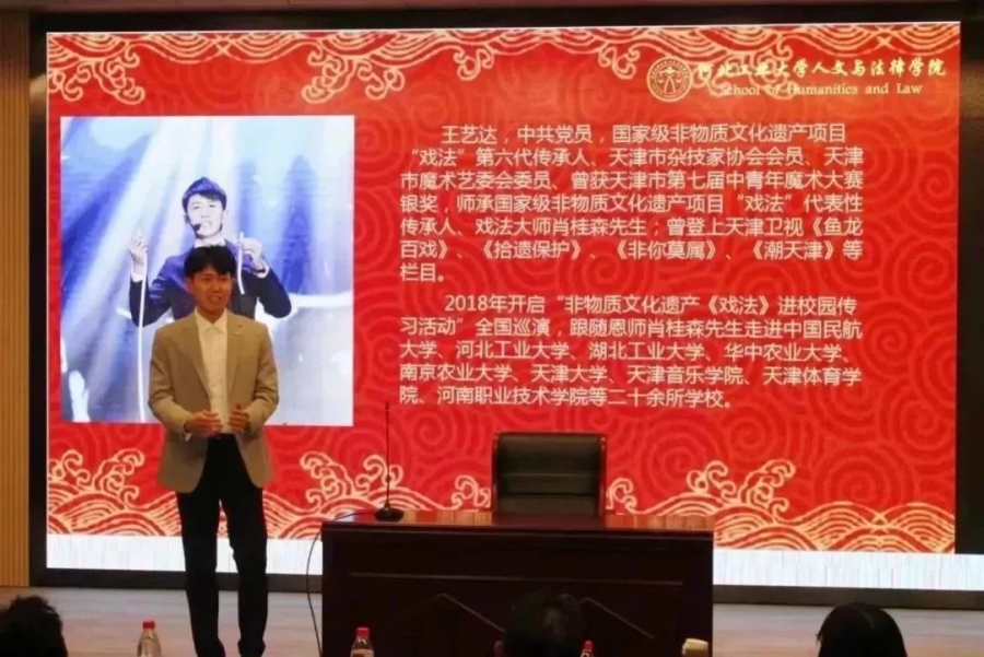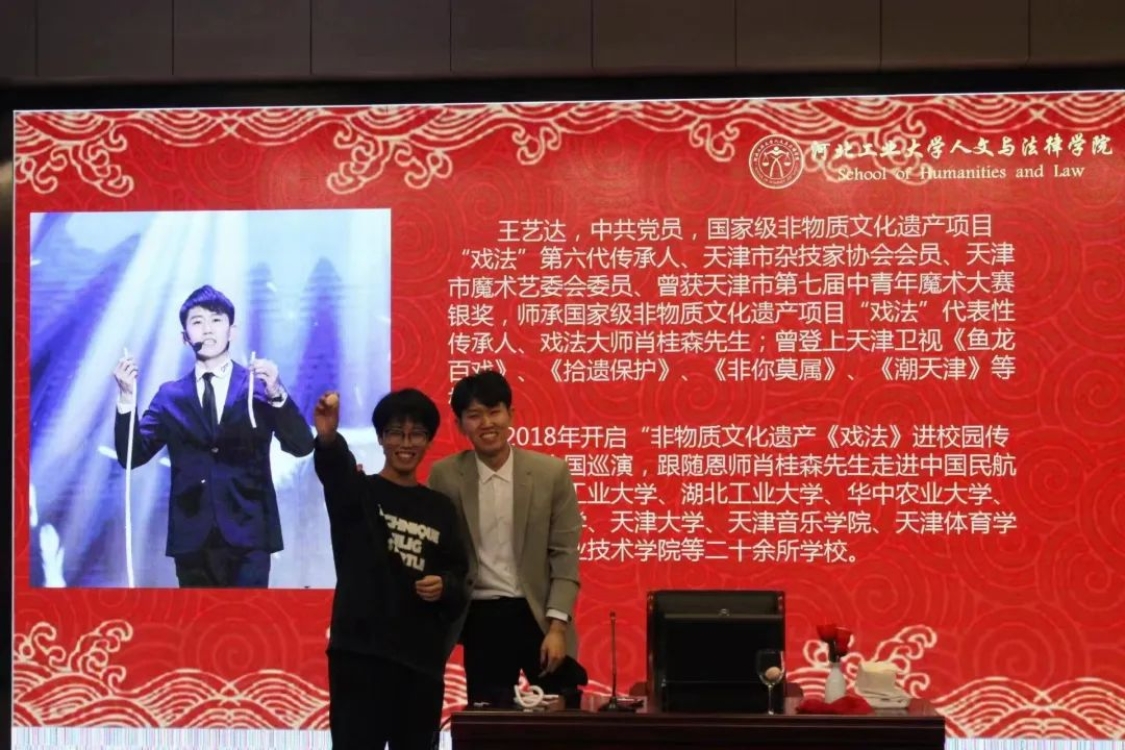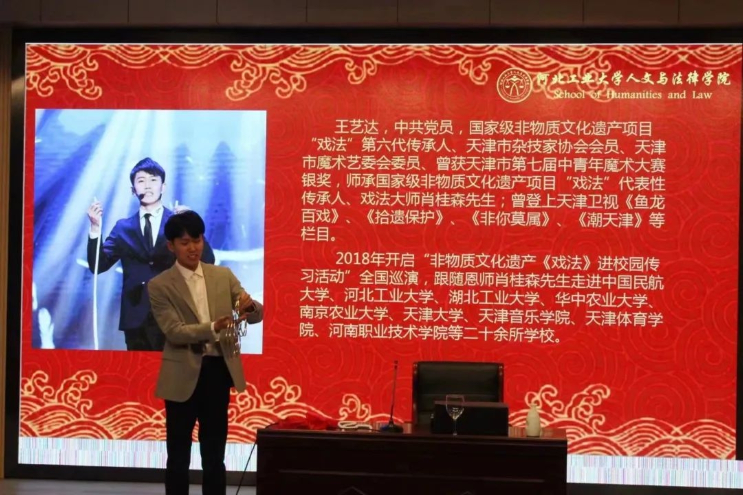 为使同学们深入了解古彩戏法的艺术魅力,认识到肩上所担负的传承非遗、延续传统文化的重任,增强我们的文化自信,在推动时代进步的同时让千年的中华文明经久不息、源远流长,电竞博彩网站-中国电竞博彩 中文系邀请到了国家级非物质文化遗产项目“戏法”第六代传承人、天津市杂技家协会会员、天津市魔术艺委会委员王艺达,于3月24日下午2点在中国电竞博彩红桥校区东院7D101为大家讲解戏法的历史起源、戏法的传承与发展现状、戏法与魔术的区别等古戏法相关的知识。