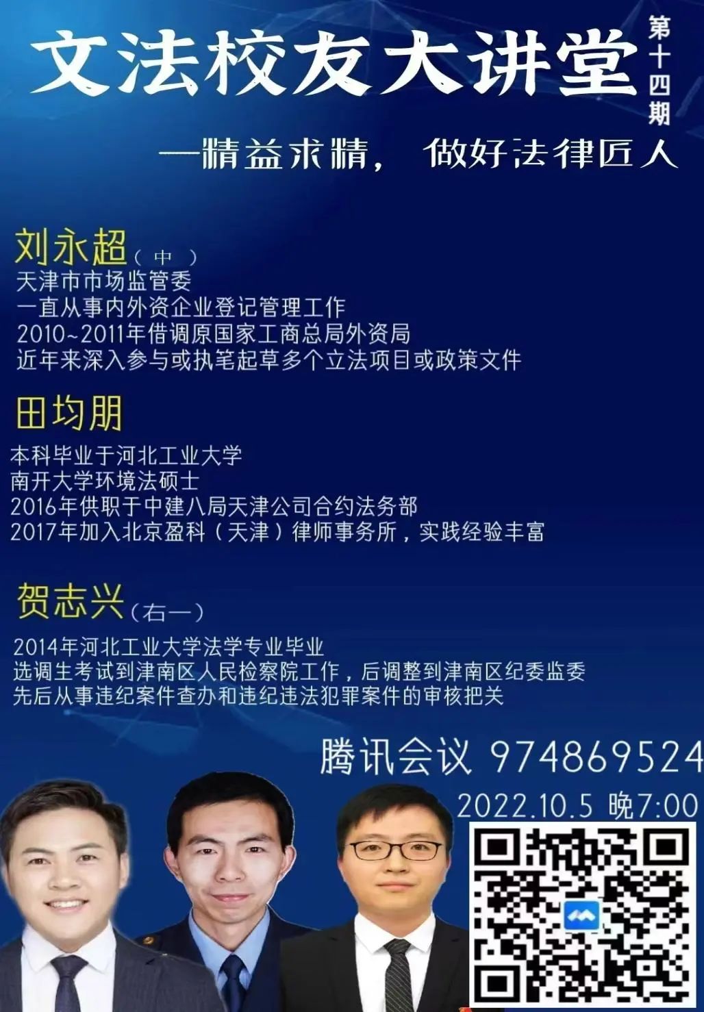 10月5日晚上7点,电竞博彩网站 举办了题为“精益求精,做好法律匠人”的线上讲座。本次讲座的主讲人为我校法学专业三名优秀校友刘永超、田均朋和贺志兴。电竞博彩网站 副院长马立民、副院长闫文博,李跃利、任红梅、蒋冰晶等老师和全体法学本科学生,以及天津、北京、石家庄等地部分校友参加本次讲座。