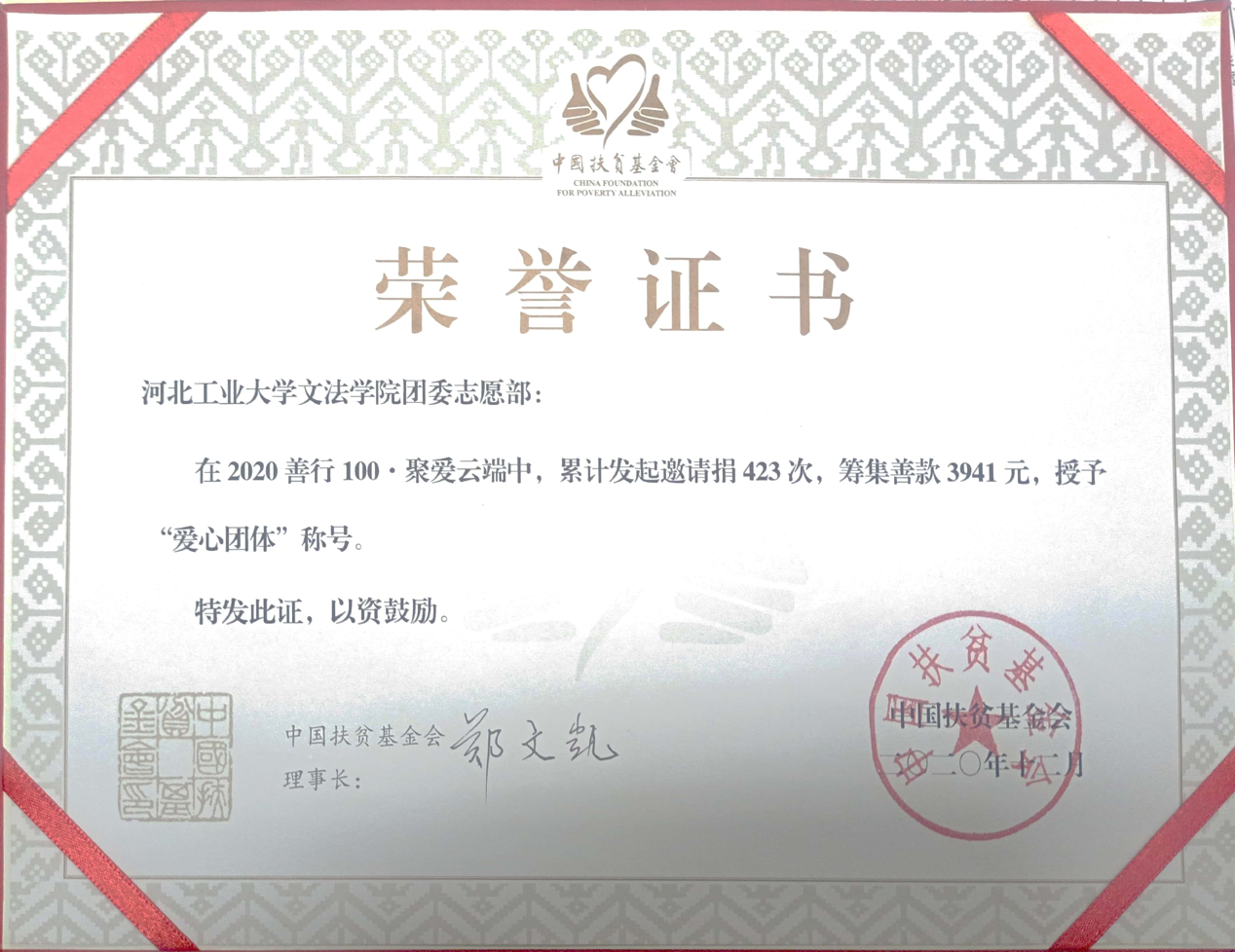 同时,文法学院深化发展长期公益志愿项目“普法进社区”,累计一年共深入社区和单位21家,开展系列普法讲座共计56场次,涉及群众2000余人次。同时在2020年“善行一百”活动中,电竞博彩网站 累计发起捐款423次,筹款3941元,被中国扶贫基金会授予“爱心团体”称号。