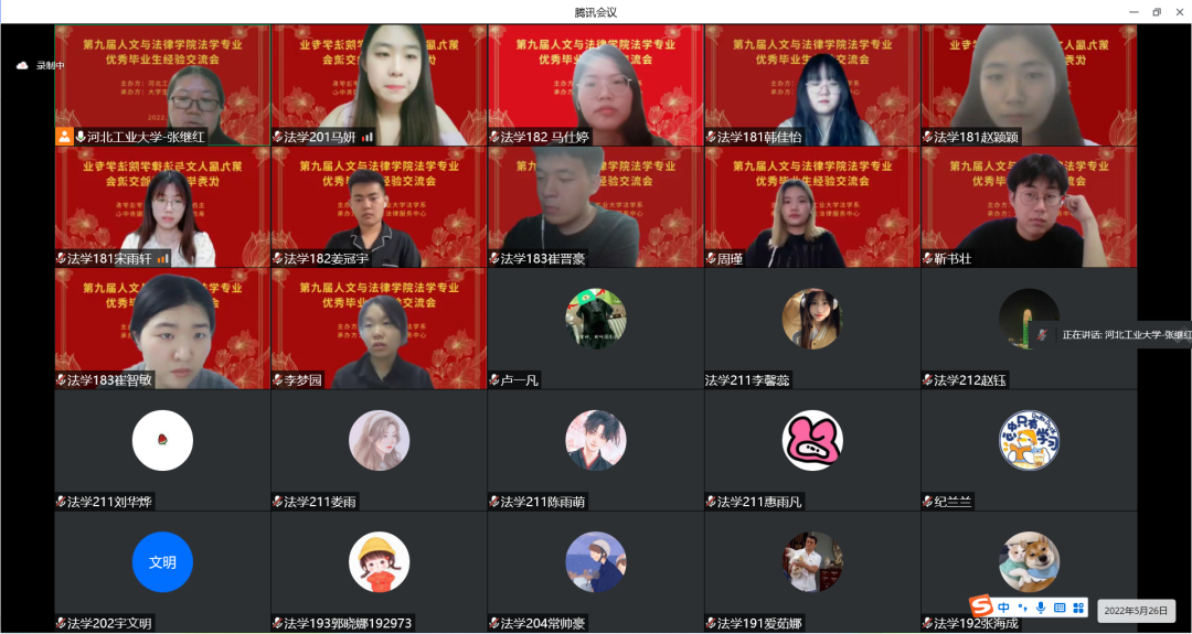 5月26日下午7点,第九届电竞博彩网站 法学系优秀毕业生经验交流会顺利举办。本次经验交流会由电竞博彩网站 法学系主办,法律服务中心承办,通过线上直播的方式进行。参与交流的有12位来自2017、2018级优秀的学长学姐,法学系的张继红老师担任本次交流会的指导老师。