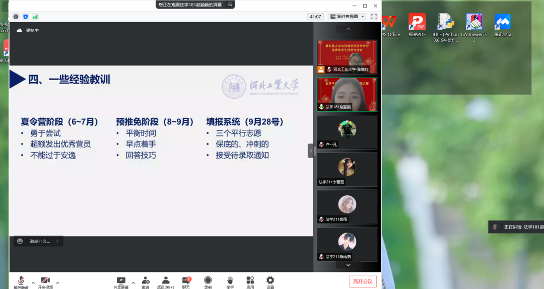 成功考研到中南财经政法大学、西北政法大学、南开大学、对外经贸大学、西南政法大学的学姐学长向大家分享了他们考研历程中的经验,帮助同学们了解择校方法、考研准备的时间以及复习的正确方法等。