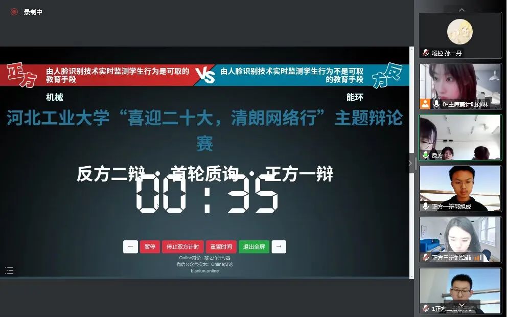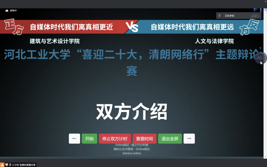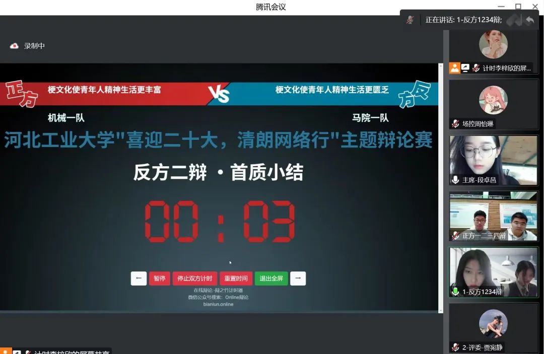 10月16日上午8点30分,中国电竞博彩“喜迎二十大,清朗网络行”主题辩论赛第二轮在线上——腾讯会议成功举办。比赛共有3轮,辩手们唇枪舌战,雄辩滔滔。