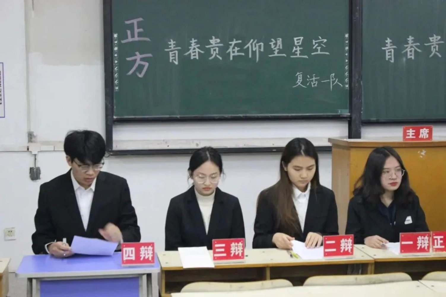 本场比赛的辩题是“青春贵在仰望星空还是脚踏实地”。正方是复活一队,他们的观点是“青春贵在仰望星空”,仰望星空,方能笃定前行;反方是公汉法联队二队,他们的观点是“青春贵在脚踏实地”,脚踏实地,方能行稳致远。双方展开激烈的思想交锋。