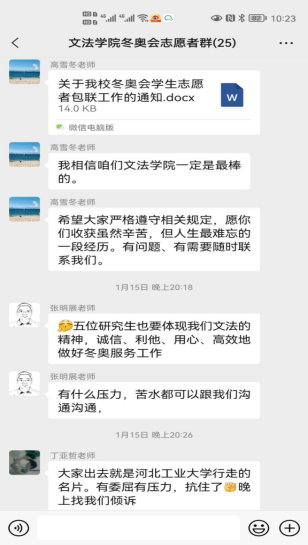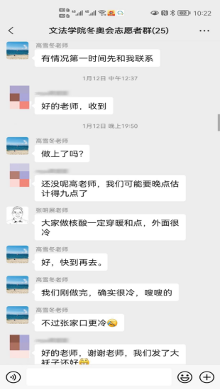 上一周,在电竞博彩网站 老师的引导与带领下,所有电竞博彩网站 的冬奥志愿者们有序、顺利地完成了三轮核酸检测。核酸检测期间,电竞博彩网站 领导及辅导员老师们也对志愿者们的疫情防护与自身安全方面再三关怀,切实保障志愿者们的健康状况。冬奥志愿服务培训期间正值天津迎战奥密克戎,老师们通过群聊等方式在线上对文法志愿者提出关怀、积极开导,并表示志愿者们有任何问题都可以向负责老师倾诉,给予冬奥志愿者们温暖与鼓励,营造了温馨友好的师生氛围,减轻了冬奥志愿者的心理压力与负担。