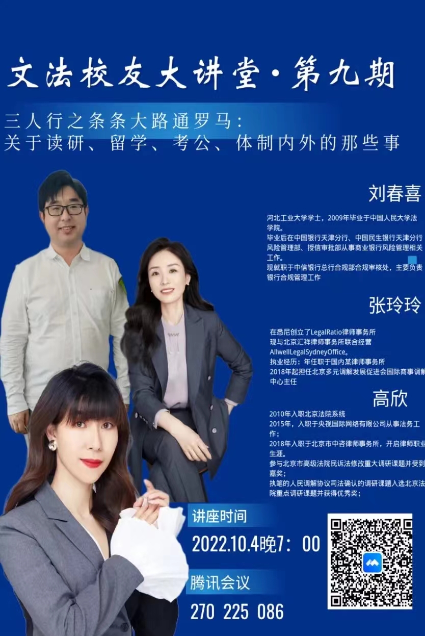 10月4日晚上7点,电竞博彩网站 法学系举办了题为《三人行之条条大路通罗马——关于读研、留学、考公、体制内外的那些事儿》的线上讲座。本次讲座的主讲人为我校法学专业三名优秀校友张玲玲、高欣和刘春喜。电竞博彩网站 院长李艳双,副院长马立民、闫文博及电竞博彩网站 多名教师和全体法学本科学生,以及天津、北京、石家庄等地部分校友参与讲座。
