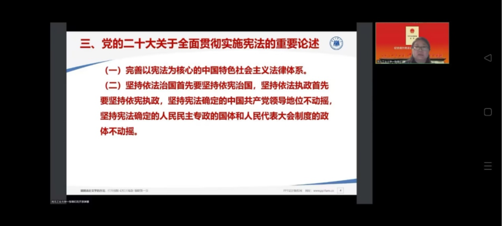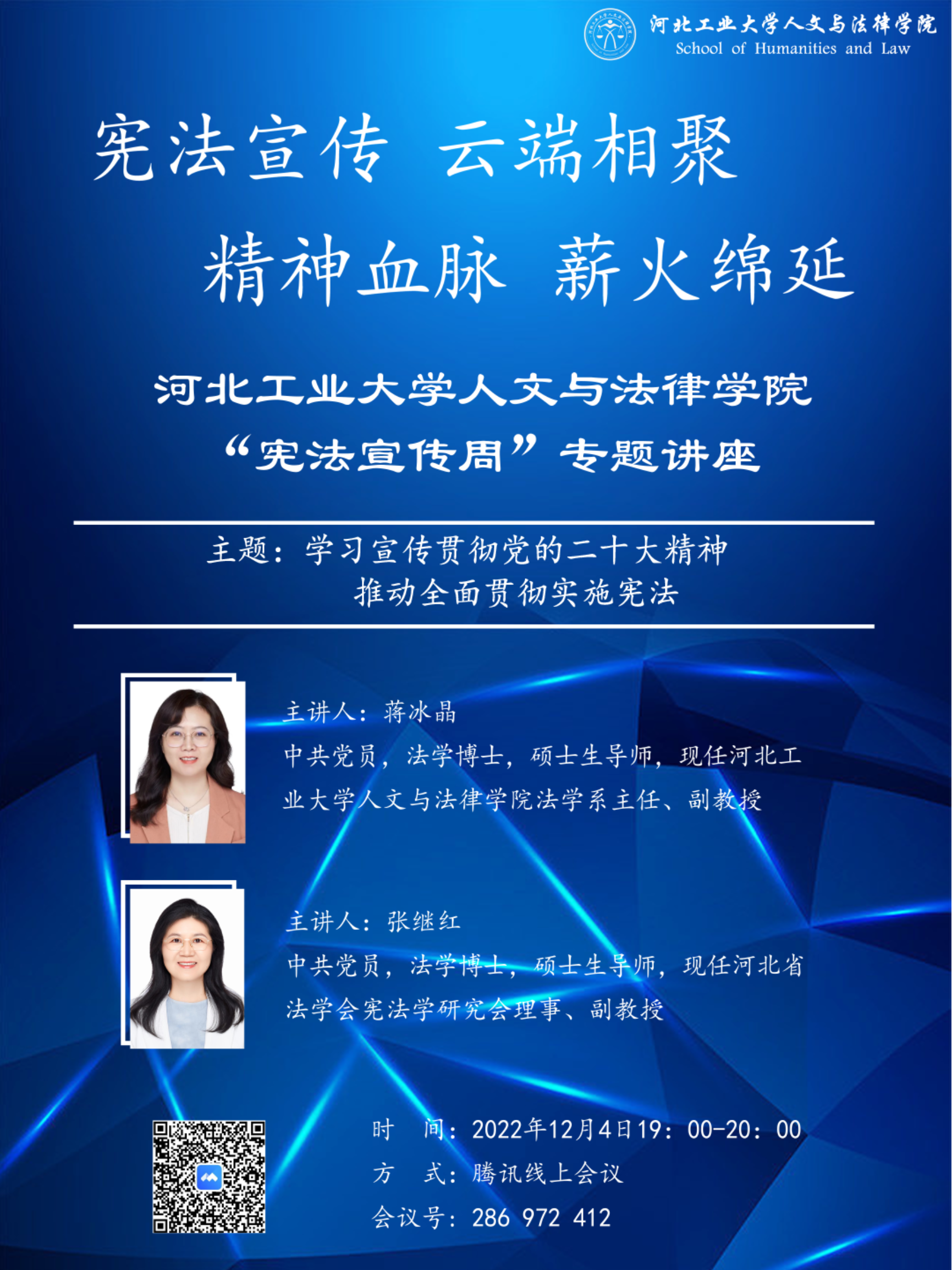 为了让同学们更深入地学习宪法,电竞博彩网站 在12月4日晚上7点至8点举办了“宪法宣传,云端相聚,精神血脉,心火绵延”宪法宣传讲座,由蒋冰晶老师和张继红老师担任主讲人。两位老师围绕着学习宣传党的二十大精神、习近平法治思想、关于保障公民权利和规范国家权力的具体事例,以及法治思维、法治思想等内容向参会的同学介绍了关于宪法的知识。