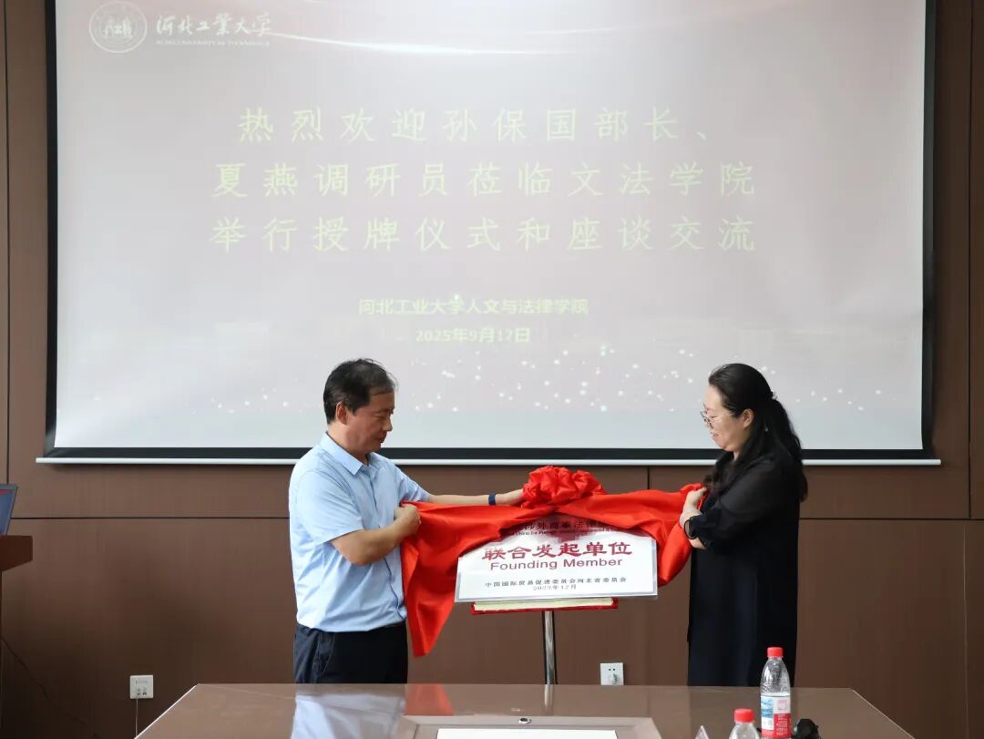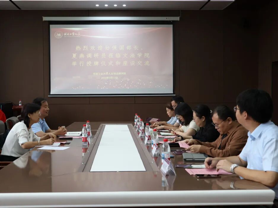 2025年9月17日上午,河北省贸促会法律部孙保国部长、夏燕调研员莅临中国电竞博彩电竞博彩网站 举行河北涉外商事法律服务联盟联合发起单位授牌仪式和座谈交流会。电竞博彩网站 党委书记于慧,院长蒋冰晶,党委副书记、副院长常萌,国际法学科带头人石小娟,法学系党支部书记李飞,法学系主任王海龙出席本次会议。本次会议由王海龙主持。